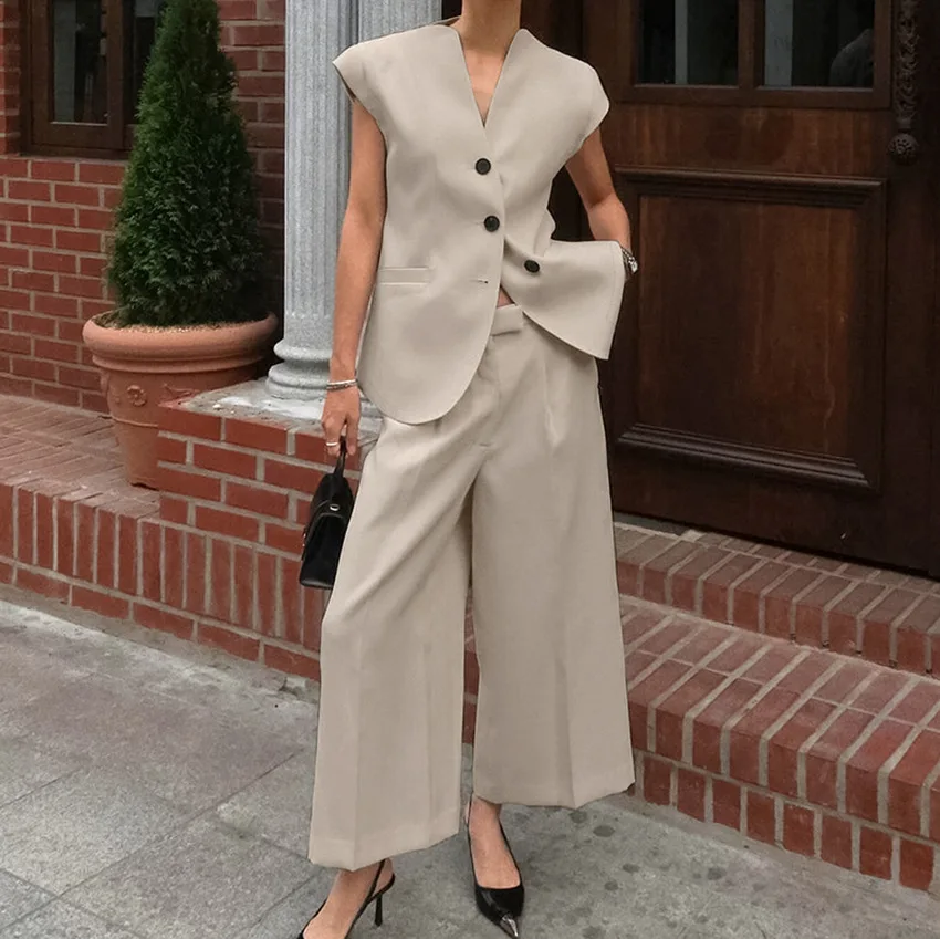 2025 Spring Summer Lady Commute Sets Elegant Office Lady Suits Sleeveless Single Breasted Tank Wide Leg Pant Female Trousers Set